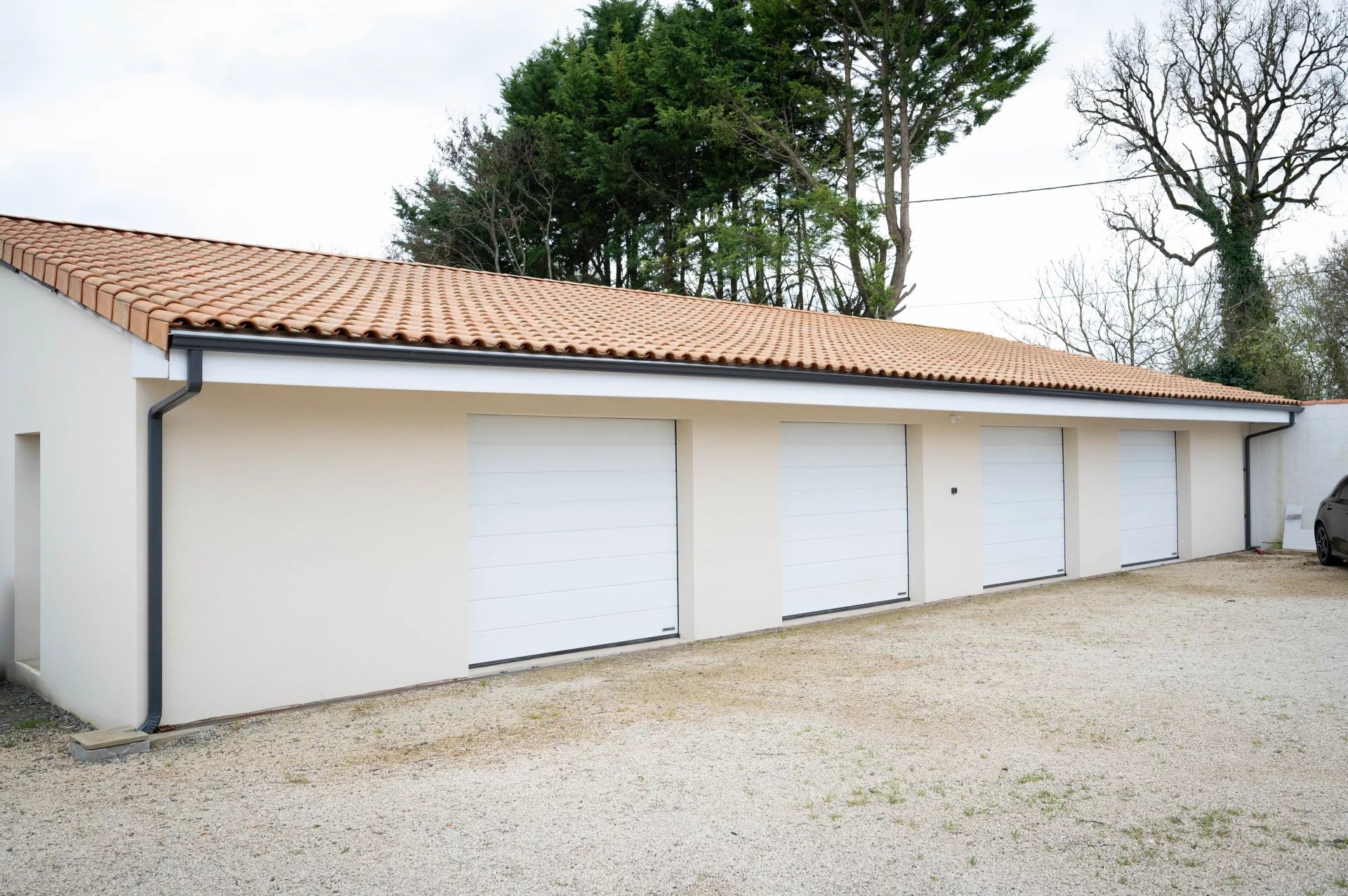 Un grand espace garage de 120m² avec 4 portes électriques et un stockage en mezzanine.