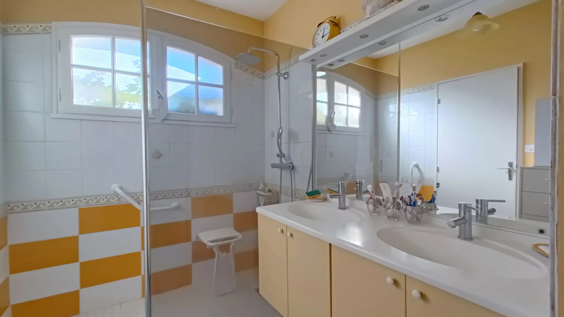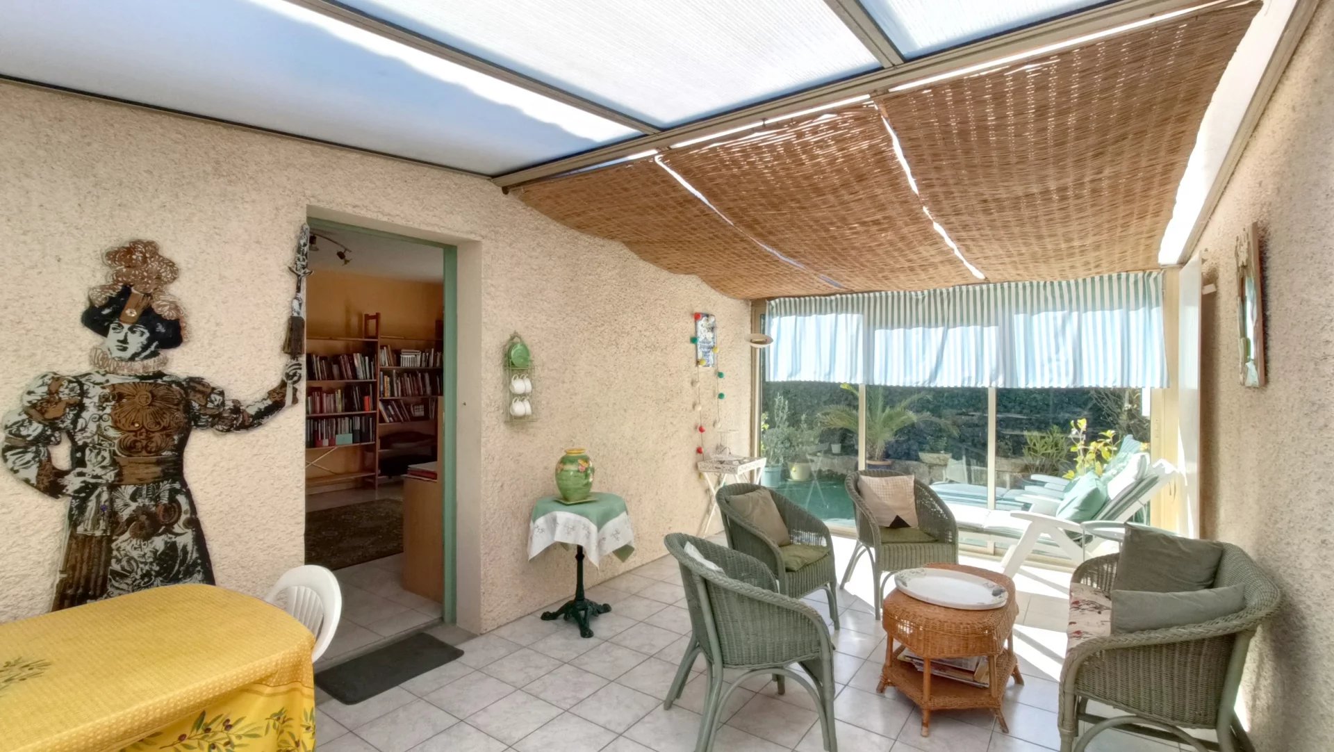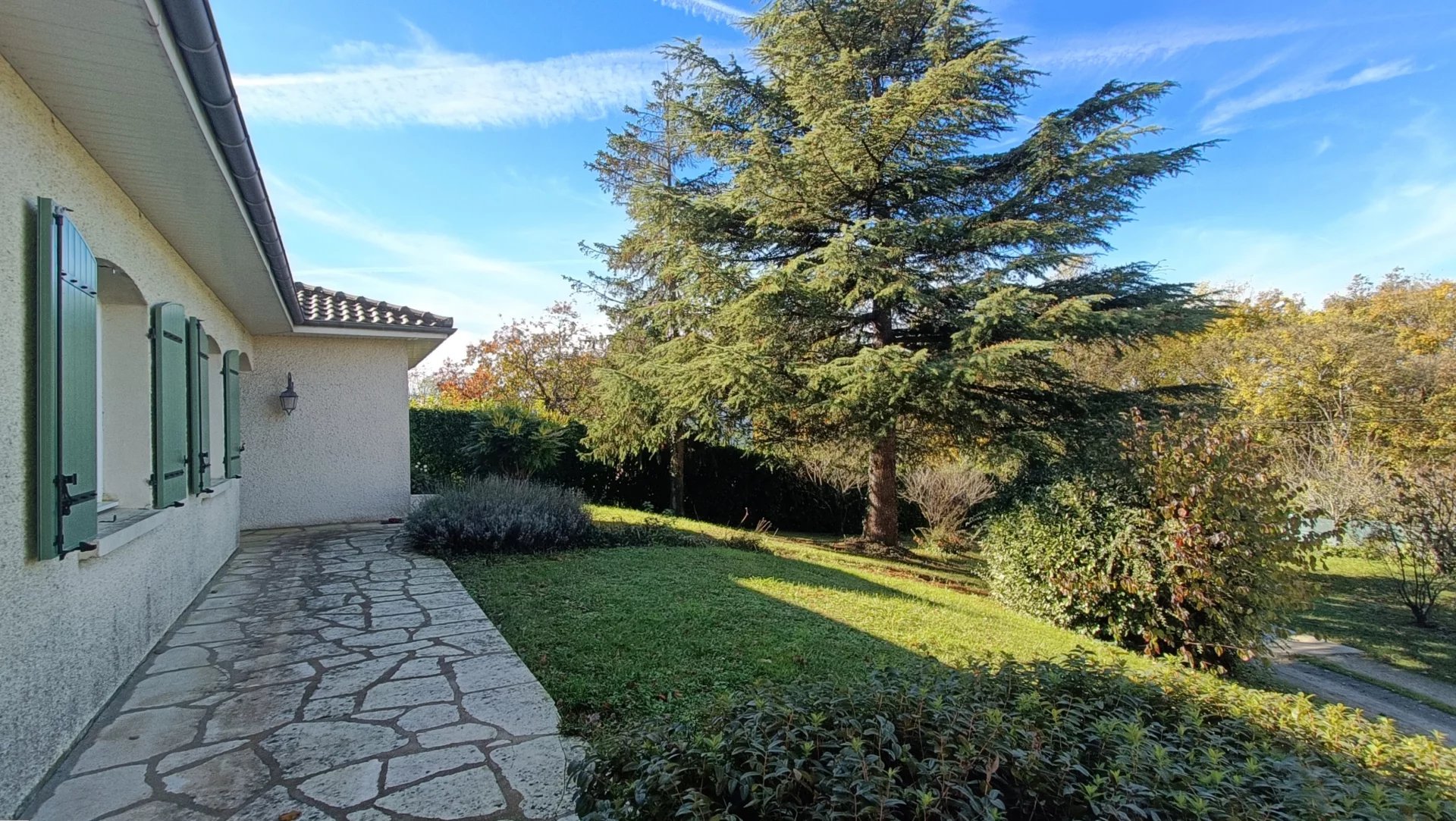 En extérieur : cave, préau, dépendances. Terrain clos et paysagé de 2 125 m2, sécurisé par un portail électrique.