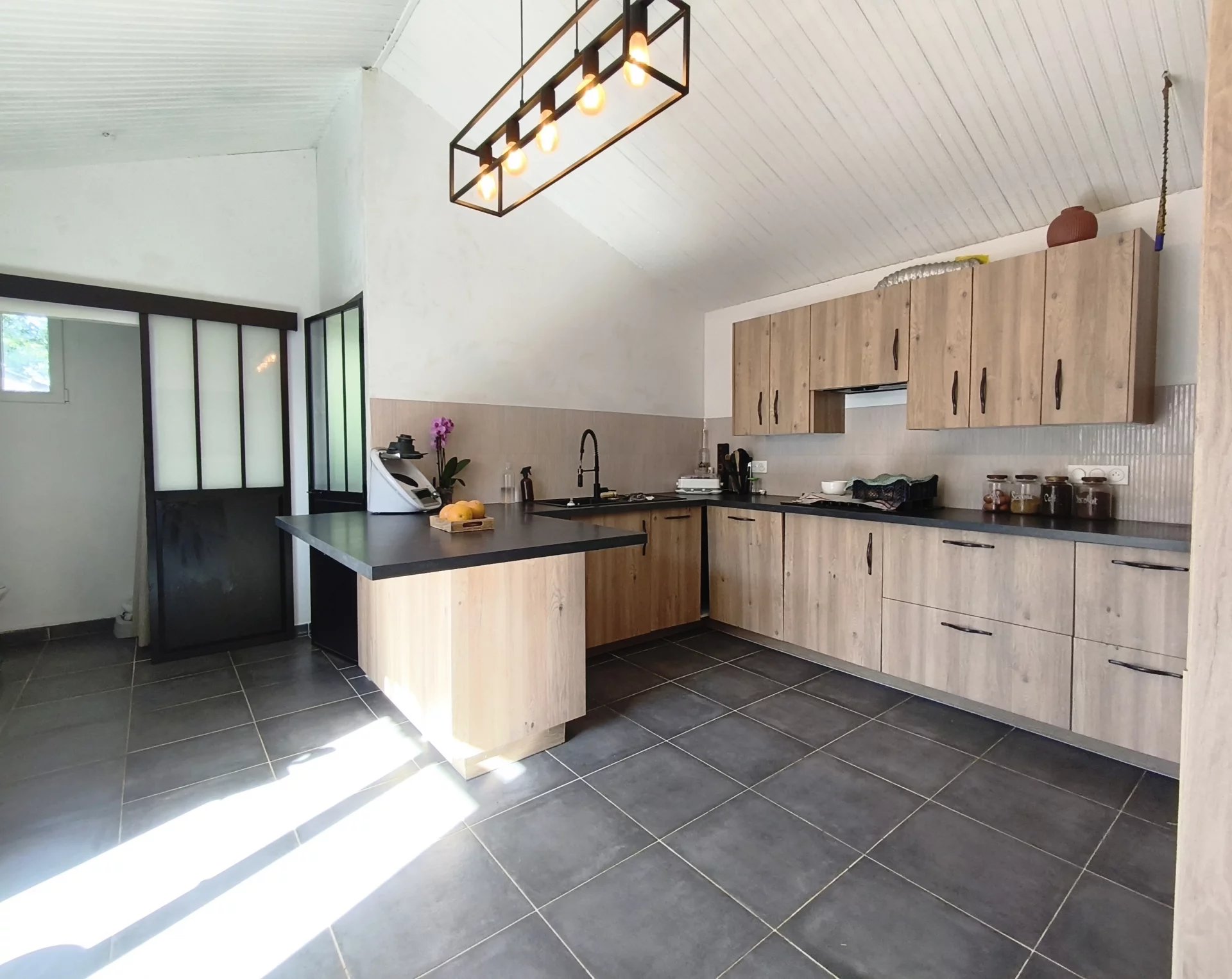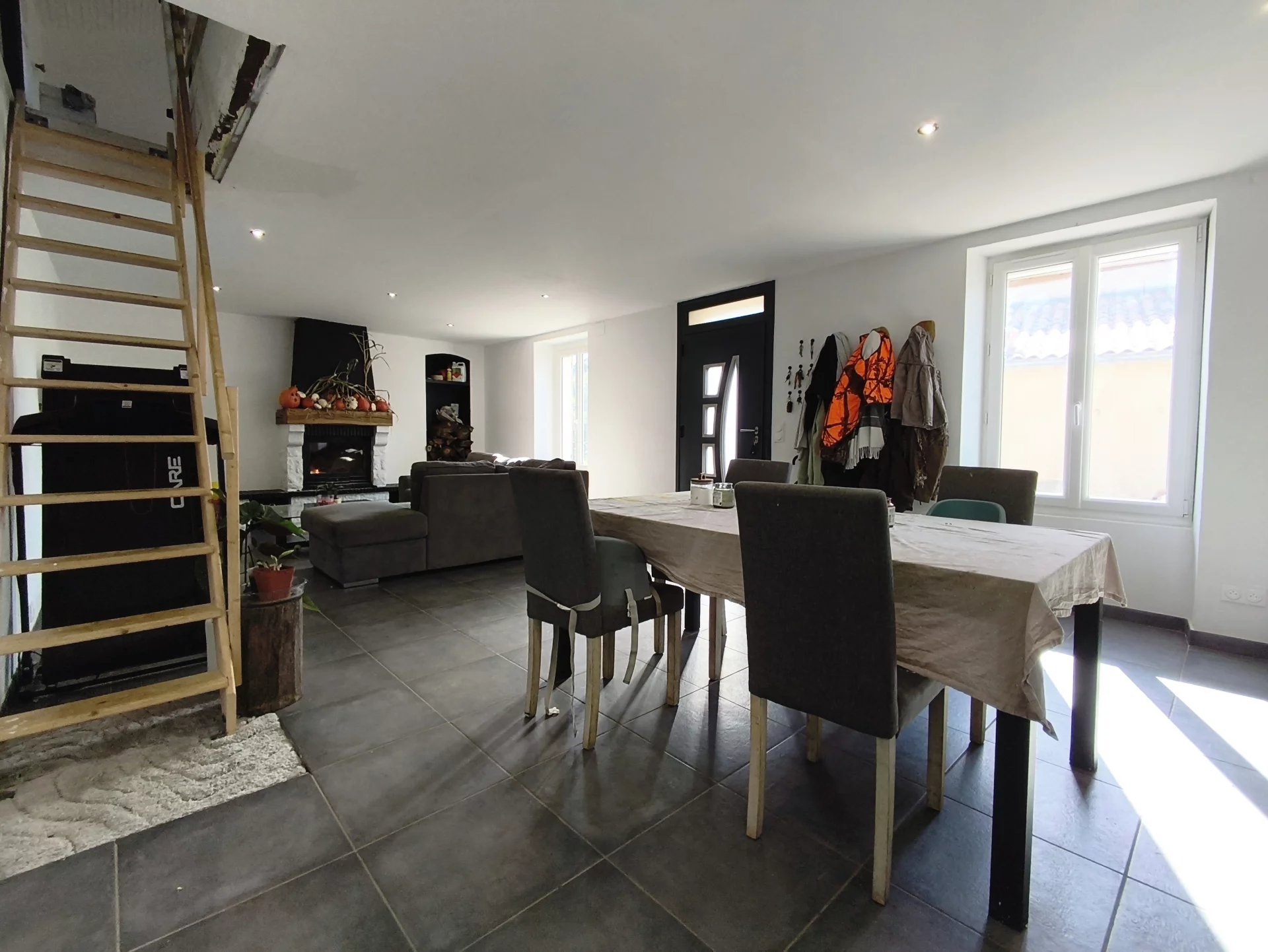 Elle comprend au RDC : une pièce de vie avec un insert à bois, une cuisine aménagée et équipée avec un coin buanderie, une salle d'eau, un WC indépendant.