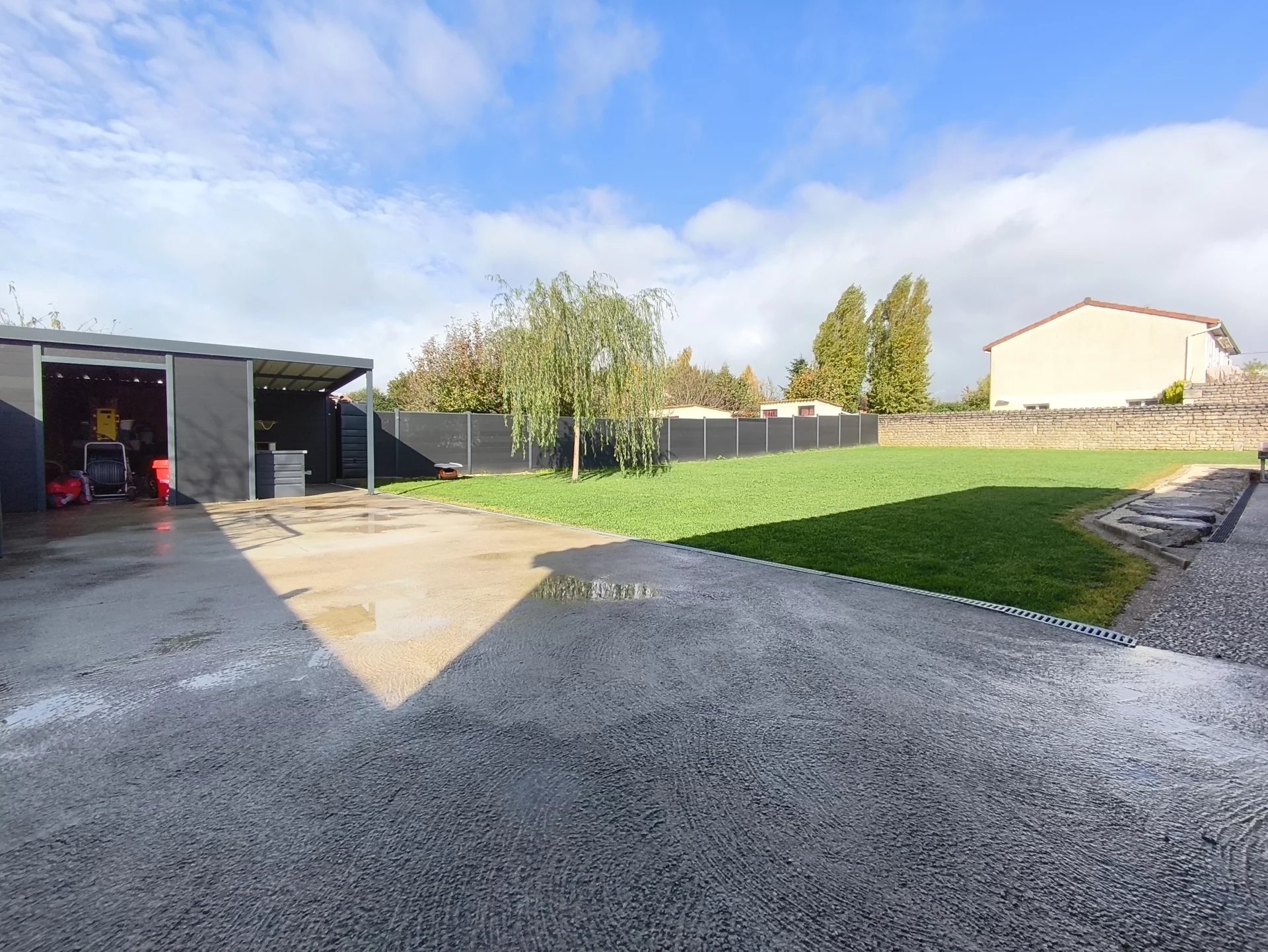 En extérieur : terrasse en béton désactivé tout autour de la maison, terrain clos de 1101 m2, portail électrique coulissant, abris de jardin.